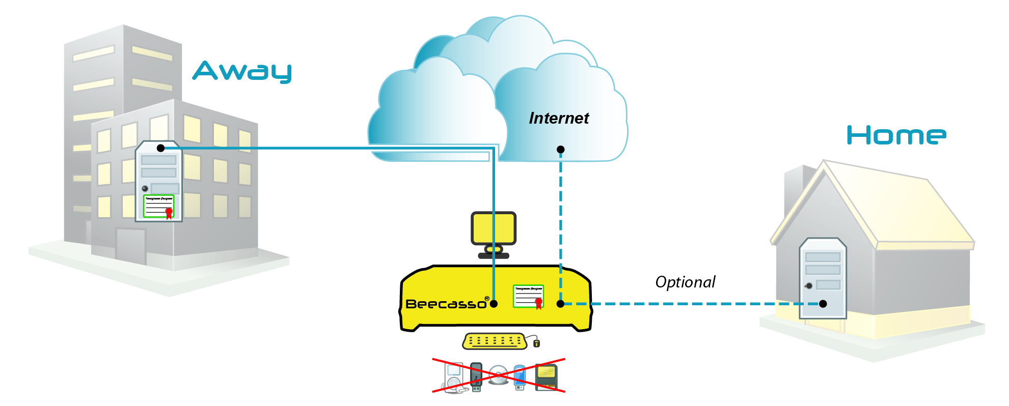 Beecasso offers a simple but secure way to connect to your work environment from home. Plug in the Beecasso device and your office (including desktop & phone) comes home.